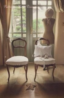 背もたれ中央に施された100年前の繊細なノルマンディーのアンティークレースがエクリュカラーに変色して、白のフレームとふわっとした朝靄の中のフェアリーの雰囲気がする二人掛けのロココ調ソファ製スタイルアンティークソファ