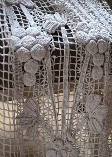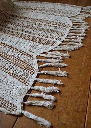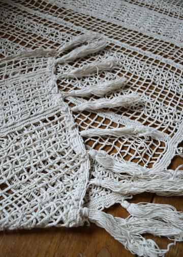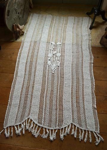 | その他商品説明 | ストライプ模様に密度が調節され編まれたフィレレースに、凛とフラワーブーケのモチーフが印象付ける大きなアンティークレース。スカラップになった裾にはフリンジが。編み物の時間にちょっとづつ編み進めて完成させる、手作業で編まれたレースです。パネルカーテンとして吊るしたり、パーテーション間仕切り、デュヴェカバーとしてベッドを飾ったりと、様々な用途に使える大きなサイズ。使用されていた為、数か所しみ、ほつれあり、年月の経過した雰囲気。 |