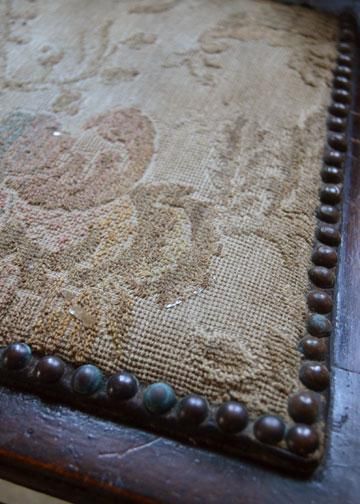 素材/材質/総重量木製にダークブラウン塗装、座面はシェニール生地張り、真鍮スタッズ留め、オリジナルコンデション。 約5kg