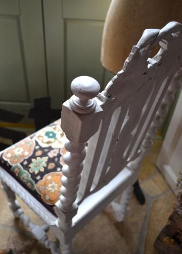 | 素材/材質 | オーク材製にホワイト系ペイント。クッション性のある座面はオズボーン柄のシェニール生地張り。座面は外せます(画像参照)。約5kg |