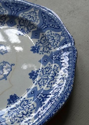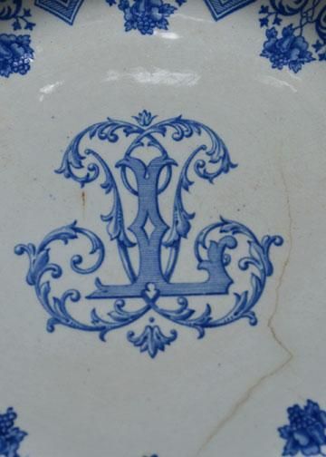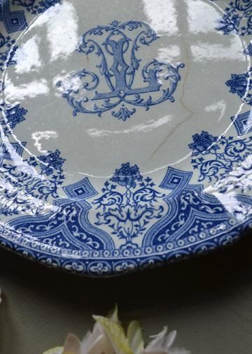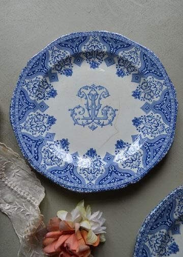その他商品説明 | フランス、ジアン社製モノグラム入りのブループレート。1821年パリの南にあるロワール河岸の豊かな自然に恵まれた町ジアンに設立され、様々なニュアンスブルー色で描く花や鳥などの手書きの柄が代表的な窯です。王侯貴族達も愛用していて、その品質の良さに説得力があります。このお皿はオーダーメイドでモノグラムが入っているオリジナル品で、イニシャルLの貴族の屋敷に収められたもの。花とジオメトリックなパターンのアラベスク風なデザインが印象的。フランス人が愛する古い陶器の質感が存在感のあるGIEN製プレート、大きく少し深さのある28〓大皿と、扱いやすい24〓ディナープレートです。 |