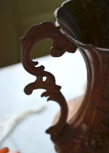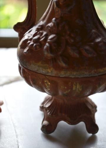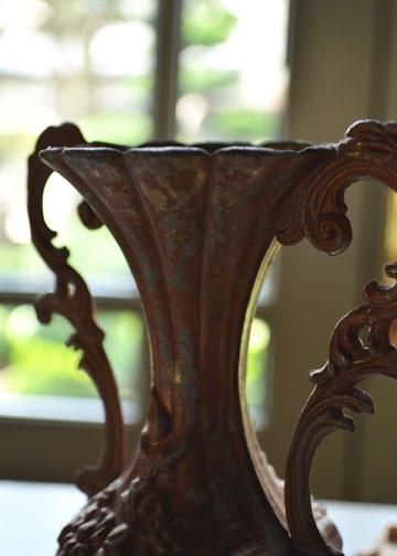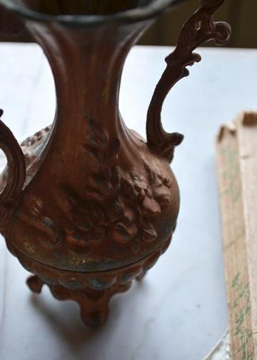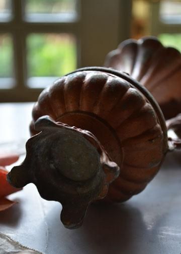 | その他商品説明 | 古くはもともとローマ人が飲み物や油、香水などを保存していた、丸いボトムに細身の長い首が美しいシルエットの小さなビュレット(花瓶)。生活に花を絶やさないフランス人のブロカント小物が並ぶ窓辺で一輪挿しとしてさりげなく飾られて。ずしりとした重厚感と、コッパープレートの剥げかけた風合いがアンティークならではの存在感に。花やグリーンをみずみすしく映えさせてくれる、相性ぴったりの小さめなフラワーベースです。 |