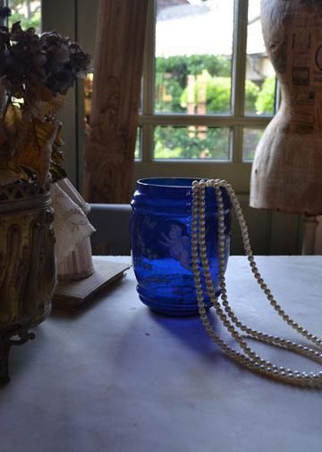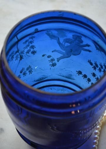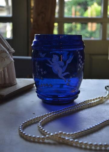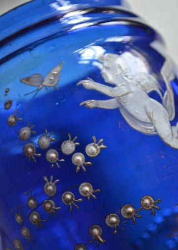 エンジェル柄フラワーベース,フラワーベース,花瓶,アンティークガラス,ブルーガラス