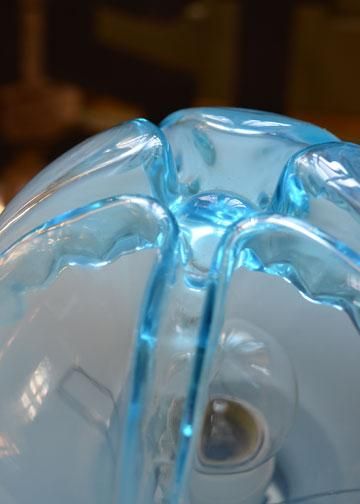![]() 卓越した技術を持つ職人たちが丁寧に作り上げた美しいガラスシェードは、淡いブルーのグラデーションや迫力のある造形が見事なデザイン。 | ![]() フロストがかったミルク色の部分から、だんだん美しいクリアブルーにグラデーションがかっていって、美しい色合い。花のつぼみの様な形がガラス職人の技術を伺わせる、複雑な凹凸の造形美です。 | ||||||||||||||