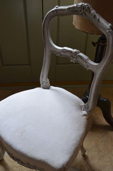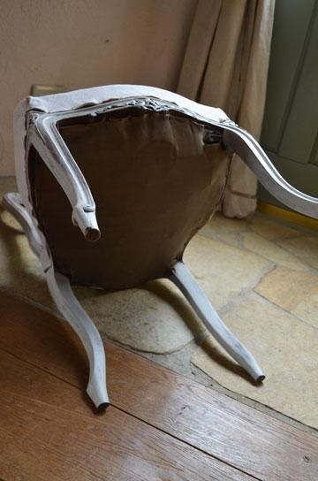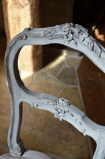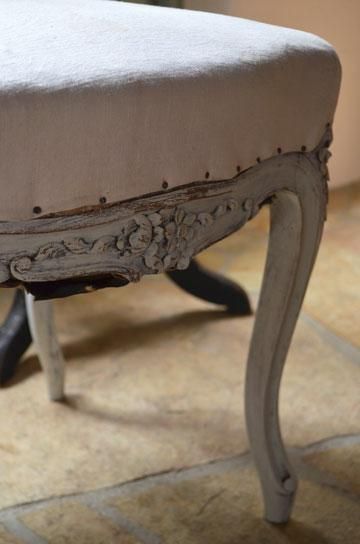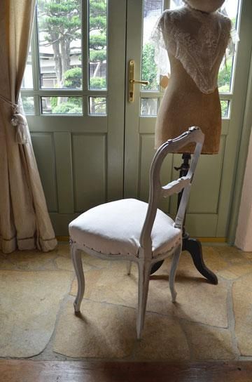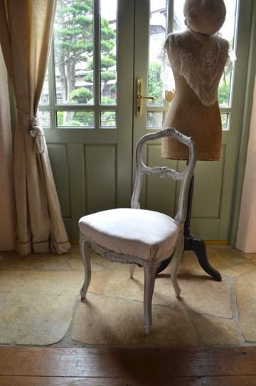 ![]() ざっくりとしたリネン地シートは、小さなビス留めが錆びて素朴で古びた風合いとなって、住人の去ったプチシャトーに残された様な、儚げでドラマティックな雰囲気に。 | ![]() 高級家具材として知られるウォルナッツ材の丈夫な木材が繊細な彫刻を可能にしたアンティークチェアなのです。 | ||||||||||||||