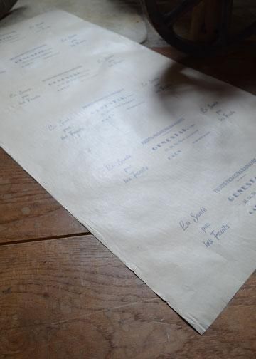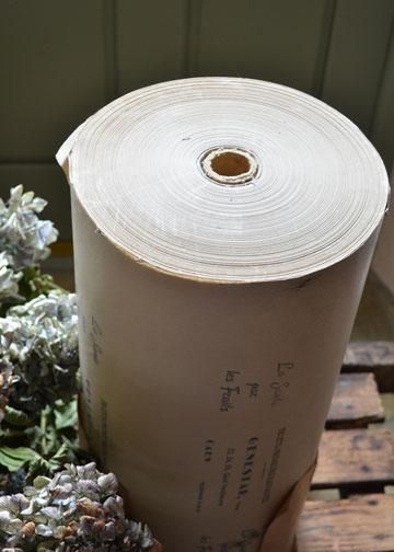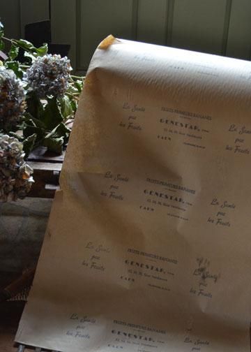 ![]() ノルマンディー地方の城下町カーンにあったジェネスタ兄弟の果物屋の為に、製紙工場で印刷されたデッドストックのラッピングペーパー。 | ![]() パラフィン蝋引きされたような、半透明の透け感のある質感に、紙の縦すじ模様と、エクリュ色の色合いがアンティークな雰囲気のあるパピエです。 | ||||||||||||||