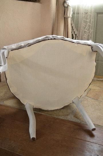 ![]() 彫刻職人によるアドリブのアシンメトリーなロカイユやアームのカルトゥーシュ彫刻は、1脚ごとに微妙に表情が異なり、手作業の温もりと味が伝わってきて、家具としてのグレードの高さが伺えます。 | ![]() 背もたれには、白糸刺繍の立体感のあるリーフが自由に広がり、カットワークの透明感が軽やかな花の刺繍。エクリュ色になった優しいチュールレースが柔らかな印象です。 | ||||||||||||||