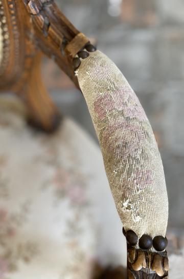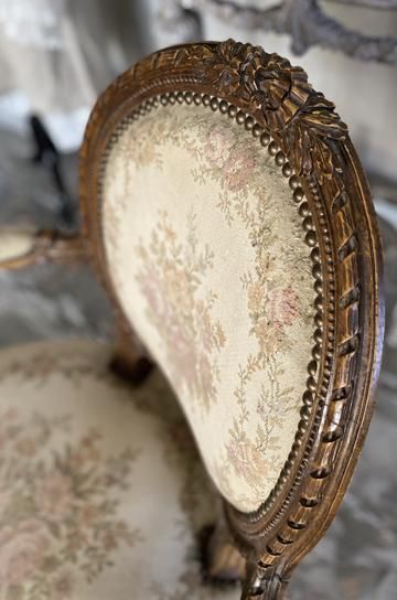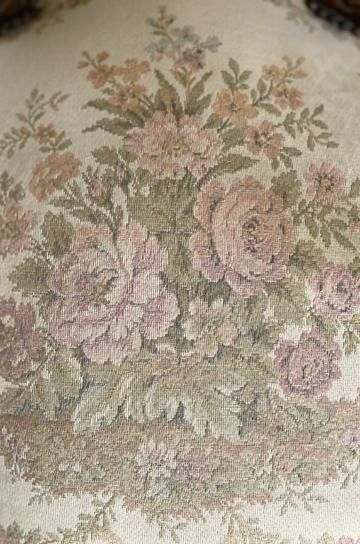 ![]() オーバル形の背もたれは、クレストレイルに人気のリボン彫刻とリーフ模様がカーヴィングされて、モールディングフレームの様なリボンツイストとビーディング彫刻が装飾性を増しています。 | ![]() ピンク系のローズ柄がクラシカルで華やかなゴブラン織りのシートと、フレームを創り上げた家具職人と彫刻職人が一体となって完成された美しいチェアとなっています。ネオクラシカルなデザインが美しい、フレンチアンティークルイ16世アームチェアです。 | ||||||||||||||