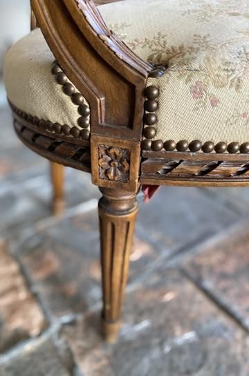 ![]() シートレールには背もたれとおそろいのリボンツイストが彫刻されて。脚はルイ16世様式に多く見られるアダムフルーテッドで、すっきりストレートの脚が華奢な印象。 |