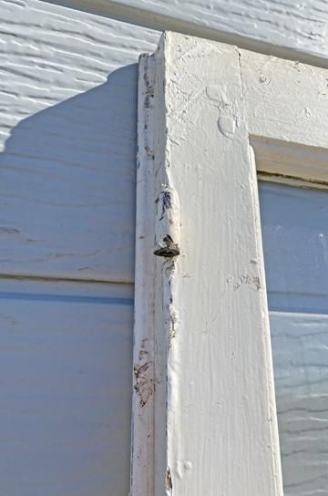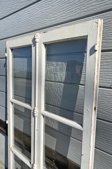備考木製にホワイト塗装、鉄製グレモン錠付きの両開きペアウィンドウ。ヒンジ受け各3か所残っています(画像参照)。取り付け金具類はありません。