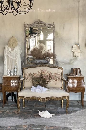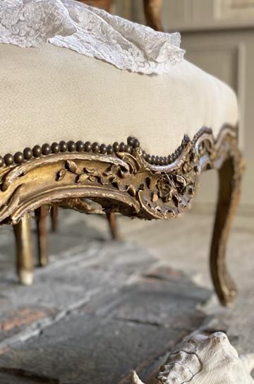 ![]() 背もたれのフレームは曲線的なロココ調シルエットに、クレストレイルにはロココを象徴する、深く躍動的なロカイユ彫刻と花が施されて。フレームには立体的な花びらが繊細な花と、アカンサスがつたい広がってゆく、カーヴィングで飾られています。 | ![]() 複雑な曲線を描き広がるアーム付きで、サロンルームでドレス姿の貴婦人が腰掛け、アームにもたれかかる姿は美しく見えた事でしょう。 | ||||||||||||||