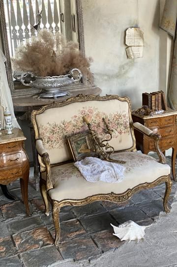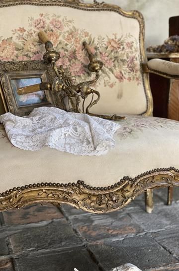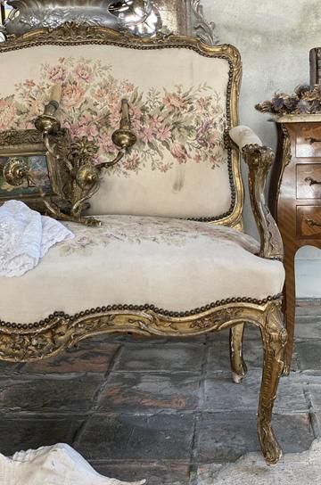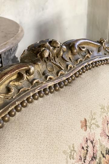 ![]() フレンチアンティークのルイ15世様式の2シーターバンケット。美しいカーヴィング彫刻のゴールドフレームとローズ柄刺繍のシートが高貴な印象のアンティークソファです。 | ![]() ゴールド塗装は年月を経て剥がれかけ、落ち着いたアンティークゴールドの風合いとなっています。 | ||||||||||||||