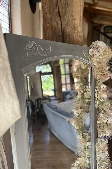 フレンチアンティークのフルレングスミラー。美しいカーヴィングがポイントのフルレングスミラーです。年月を経過し古びた風合いのカーヴィングにフランスらしいマットなグレーペイントがシャビーシックな雰囲気です。ミラーのトップはアーチになっていて、さり気なく光を反射しキラキラ明るい。コーナー2か所にはスクロールがデザインされたカーヴィングが施されていていて、より豪華さを増しています。サイドにはミステリアスに数字の3と彫られています。De La Soul曰く魔法の数字です。室内装飾に欠かせないアンティークミラー。大きめで装飾的なミラーは部屋に豪華さと華やかさ、明るさや奥行き感を与えてくれる、万能アイテムとしてデザイナーやインテリアコーディネーター等にも人気です。もちろん玄関、クロゼットルームや寝室等に身だしなみチェック用の実用的な鏡として取り入れても。またはショップのディスプレー等にも存在感があって、アンティークな世界観を増してくれます。優しく装飾的な雰囲気のフレンチアンティークフルレングスミラーです。