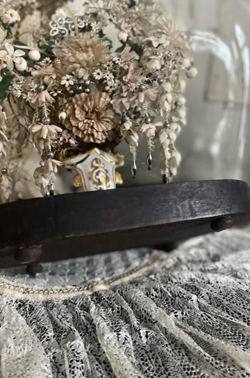 グローブドマリエのディスプレーガラスドーム。マリアージュティアラやブートニアを飾る為の美しいディスプレー台と花瓶に入ったブートニアとティアラで飾られています。グローブドマリエ(Globe de mariee)とは、結婚式で使用したティアラやアクセサリー等を飾る為のディスプレーケースで、家族や兄弟、親戚から結婚のお祝いにプレゼントされたものです。ナポレオン3世時代、1800年代に流行し、1910年代に第一次世界大戦で生産がストップしてしまうまで、多くの花嫁達の思い出を保管してきました。ブラックの木製ベースにドーム型のガラスは薄いガラスの生産が始まる初期の物で、ハンドメイドで作られ、よくぞ残っていてくれたと感動する、迫力ある大きさで繊細な品。中にはマリアージュで用いたティアラとブートニアが飾られた花瓶が。ブートニアには様々な花が飾られています。花瓶も全てハンドペイントの逸品。様々なアイテムで装飾された美しいグローブドマリエで、送り主のお祝いの喜びや愛情が伝わってきます。全てが繊細に作られた儚げな印象は華やかで、存在感のあるオブジェとして空間を印象付けてくれます。フレンチアンティークのグローブドマリアージュです。