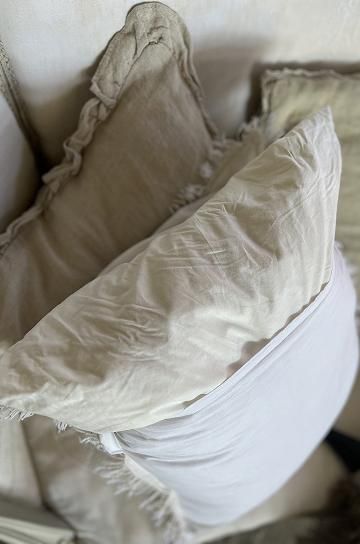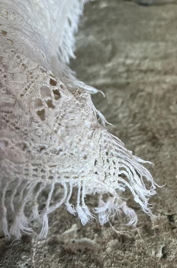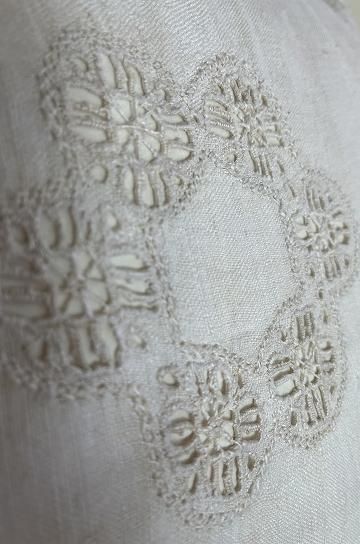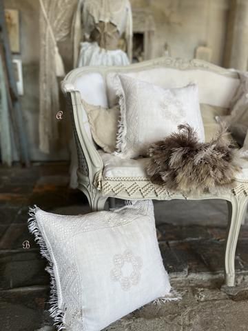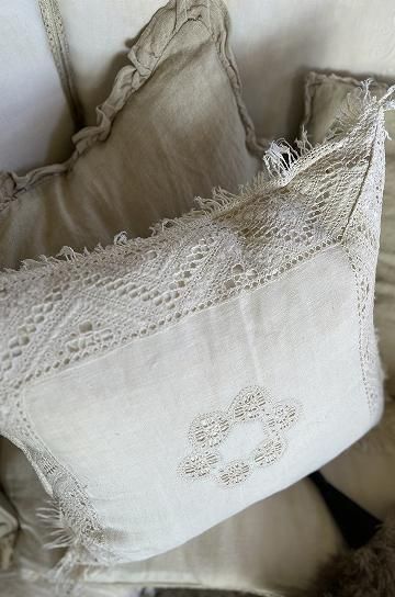 ![]() カットワークを合わせた花模様のマシーンカットワークレースの透け感と太めの麻糸で織られた立体的なフリンジがクッションの周囲を囲み表情のあるクッション。 | ![]() ふんわり柔らかい麻の素材に裏面にもヴィンテージの綿が添ええられて、小花模様が透かされて、可愛い雰囲気です。 | ||||||||||||||