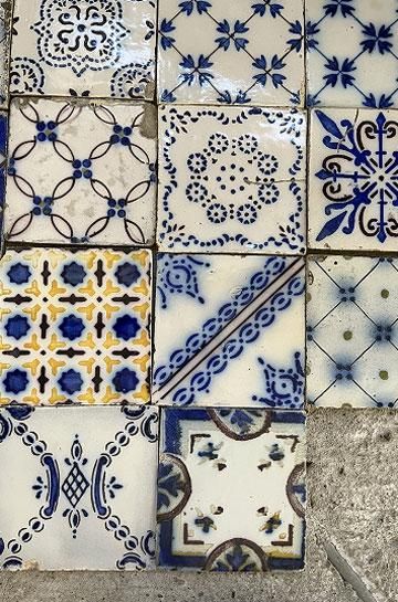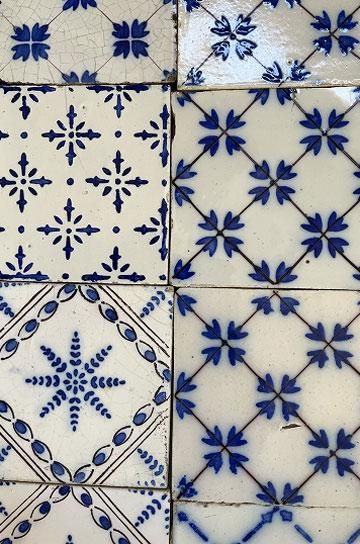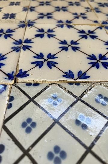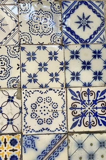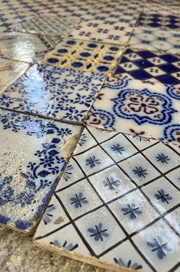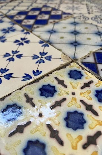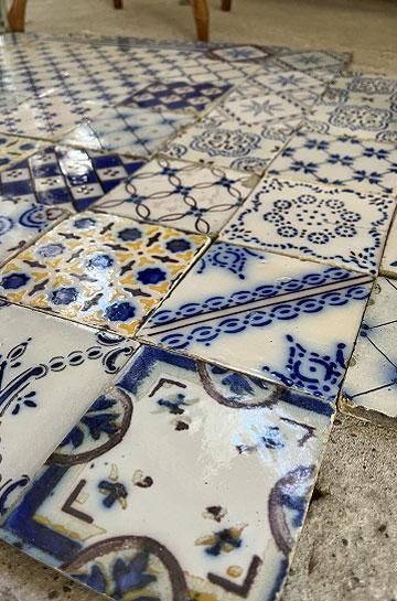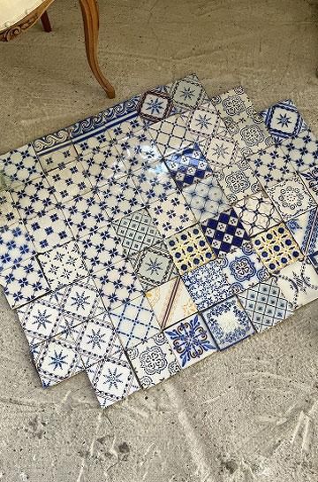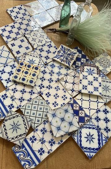 ![]() ステンシルスタンプで模様を付けて一枚ずつ丁寧にハンドメイドされているので、それぞれが全部違ったニュアンスのアンティークタイルです。 |