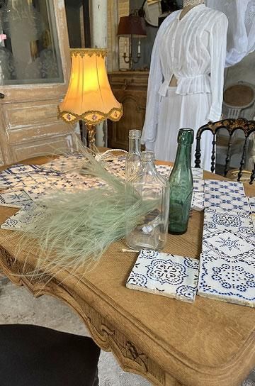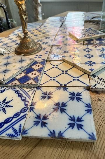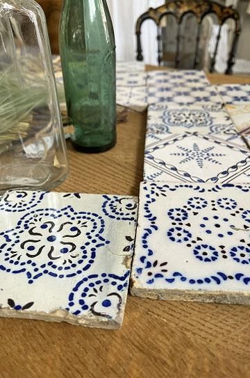 | 1880年頃のフレンチアンティークタイルです。手作りならではの温もりある風合いが魅力的な、11cm角のテラコッタ製タイル。1点1点異なるブルーの絵柄が描かれた1点物のタイルです。高熱で上薬が流れてしまったものや半ずれしているもの等、1点1点が異なった個性を放ち、またそれぞれの経年を経てぞれぞれの味わいに変化しています。光沢のある釉薬がかかり、光が差すとキラキラと風景を映し出す鏡の様に綺麗です。使われてはずされた時のセメントが付着していたり、背面もそれぞれ異なった刻印が押されたりしています。背面はテラコッタ素地の色味になります。ステンシルスタンプで模様を付けて一枚ずつ丁寧にハンドメイドされているので、それぞれが全部違ったニュアンスのアンティークタイルです。4枚並べてフラワーベースを置いたり。鮮やかな鍋の鍋敷きにしても綺麗。テーブルコーディネートのアクセントにも。ガーデンの壁面に貼り付けて南仏風の演出に。アクセサリー作家さんやハンドメイド作品の背景にしても良いですね。アイデア次第で取り入れたい、フレンチ伝統のステンシル陶器製アンティークタイルです。 | ![]() | ||||||||||||||