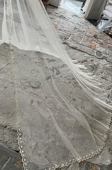 ![]() ふんわりと軽やかで儚げなチュールレースのウェディングベール。 | ![]() 180度広がる扇型のチュールレース縁取りに3.5cm置きにスカラップと星模様がハンドステッチされたウエディングベール。 | ||||||||||||||
