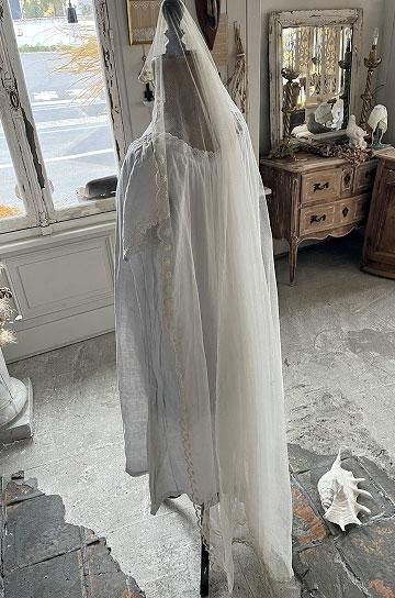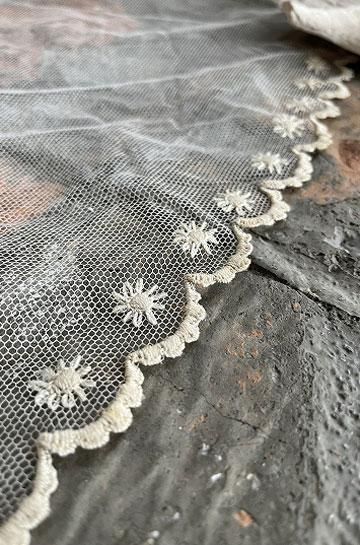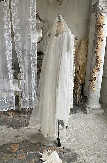 | フレンチアンティークのマリアージュベール。ふんわりと軽やかで儚げなチュールレースのウェディングベール。180度広がる扇型のチュールレース縁取りに3.5cm置きにスカラップと星模様がハンドステッチされたウエディングベール。繊細でしっとり落ち着きのあるリネン糸のアンティークレース。ふんわりと顔を覆いエクリュカラーになったニュアンスが、しっくりと品のあるマットな雰囲気のショート丈ベール。扇形の広がりのあるので、ボリューム感がアップして、より美しさを引き立てています。背丈ほどのたらりと下げたベールは、表面の方の裾に、ぐるりと1周、エクリュの刺繍が施されているので裾回りで、とろんと垂れ、波打つシルエットが美しい。年月を経過してはかなげな風合いになったアンティークチュールレース独特の、柔らかな透明感が何といっても魅力。写真映りも柔らかく優しい雰囲気なので、撮影小物としても人気です。アンティークのあるディスプレーとしてレースやブロカントと合わせたり、マリアージュサロン、クチュリエ風ディスプレーに。アイデア次第で美しく飾りたい、アンティークマリアージュベールです。 | ![]() | ||||||||||||||