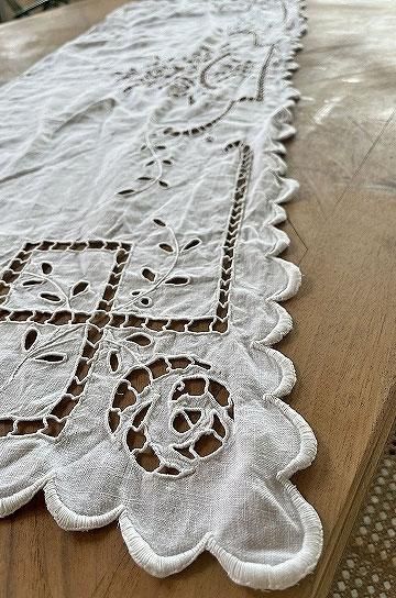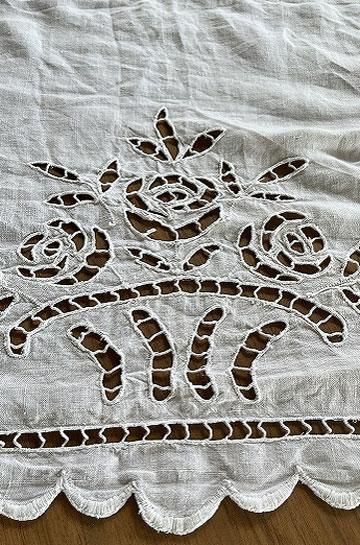 角ローズのモチーフをリネンのホワイトの地にカットして刺繍をして縁取りをする透け感が美しい、フレンチアンティークレース。