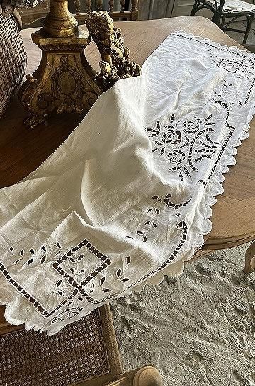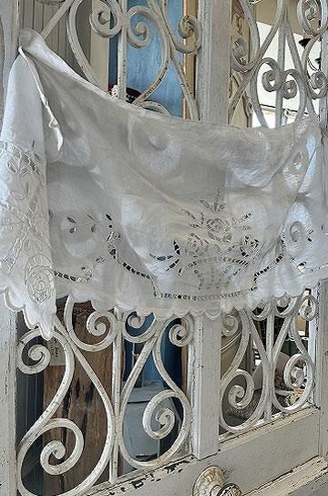 | フレンチアンティークのカットワークレース。ローズのモチーフをリネンのホワイトの地にカットして刺繍をして縁取りをする透け感が美しい、フレンチアンティークレース。コの字型にスカラップを施した重量感のある手刺繍のアンティークレース。中央には3つのバラを配したバスケットの模様でデザインされた横広がりの長方形の形。コーナーにはシンメトリ―にローズとリーフの動きのあるデザインで修められ手仕事のセンスを伺えるレースです。さらっと張りのあるリネン地はほんのり透け感のある薄い生地で、不均一な糸が味わい深い。窓にタペストリーとして、又、小窓のカーテンとして飾ったり、テーブルやシュヴェ等に敷いたり、バスケットにふわりと掛けたり。たらんと垂らして透け感と立体感を出し、ブロカント小物と組み合わせたディスプレーにも。年月を経過した優しい風合いが味わい深い、フレンチアンティークレースです。 | ![]() | ||||||||||||||
