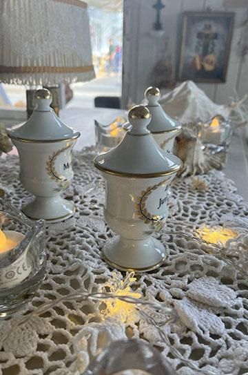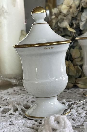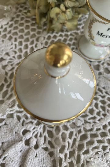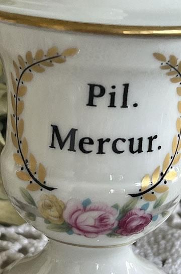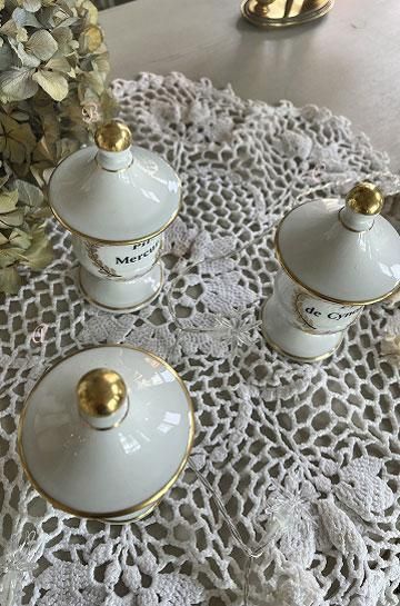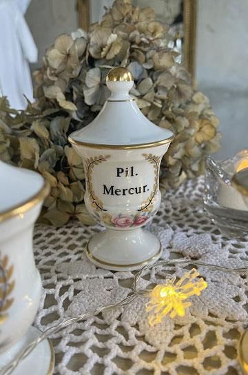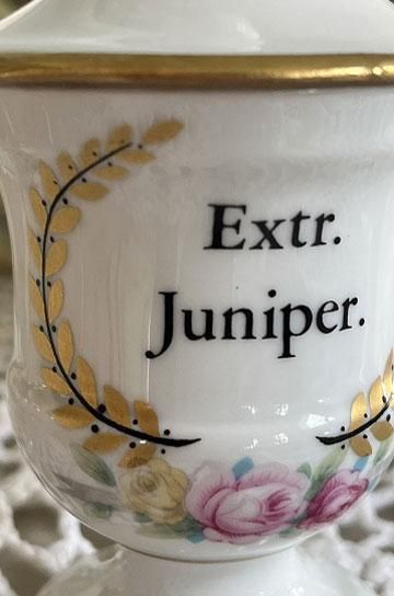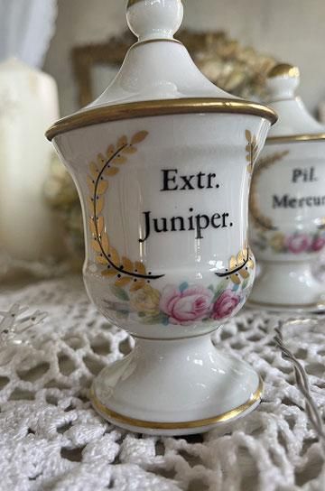 ![]() 業務用に作られたので一般的に作られておらず、生産数も少なく、中々市場に出回らないのでとっても希少なファーマシーポットですが、その美しさから、人気が高いコレクタブルなアイテムです。 | ![]() 美しいリモージュ製の陶器に、リムには金彩装飾が施され、高級感のある雰囲気。ラベル部分はブラックと金彩で装飾的、a:extr Juniper(ジェニファー) b.:Pil Mercur(彗星)c:Pil de Cynogle(サイノグル)とレタリングされています。こちらはおそらくフランス語で素材の名前が書かれているようです。 | ||||||||||||||