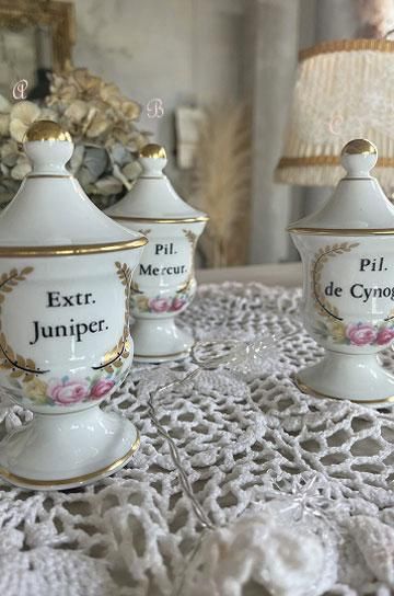 | フレンチアンティークのファーマシーポットa,b,c。古くから受け継がれたフラスコ画や装飾棚が自慢のフランスの薬局ファルマシーで、薬やその素となる自然素材やハーブ、軟膏等を保管していた、陶器製の蓋付きアンティークボトルです。様々なラベルでずらりとキャビネットに並ぶ姿が威厳のある雰囲気で、揃えてコレクションしたくなります。美しいリモージュ製の陶器に、リムには金彩装飾が施され、高級感のある雰囲気。ラベル部分はブラックと金彩で装飾的、a:extr Juniper(ジェニファー) b.:Pil Mercur(彗星)c:Pil de Cynogle(サイノグル)とレタリングされています。こちらはおそらくフランス語で素材の名前が書かれているようです。業務用に作られたので一般的に作られておらず、生産数も少なく、中々市場に出回らないのでとっても希少なファーマシーポットですが、その美しさから、人気が高いコレクタブルなアイテムです。ファーマシーや病院のディスプレーとして、または世界最古の薬局サンタマリアノヴェッラの様にルネサンス期の薬屋さんから始まったコスメやハーブ、ヘルスケアを思わせる、古のアンティーク壺が並ぶショップディスプレーにも、パルファム、ソープ、クリーム、ハーブ等と相性の良い世界観を持ったポットです。ずしりとした重厚感と、100年以上経過した古い手作り陶器の風合い、美しいラベルに引き込まれる、フレンチアンティークのファーマシーポットa,b,cです | ![]() | ||||||||||||||