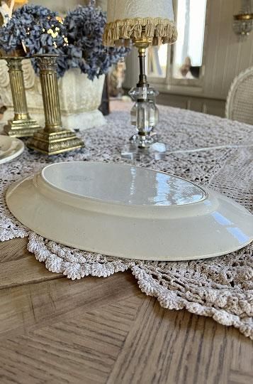 | フレンチアンティークのオーバルプレート。1900年代前半に作られた磁器製プレートです。前菜や盛り分け前のオーバルプレートです。グリニーアルボラス窯刻印入り(Grigny Arbaras)のオーバルプレートです。アカンサス模様のロココ調にバードネスト模様。乳白色のエクリュになった古陶器にペルシアンブルーの転写プリントです。手作りの焼き菓子や使い勝手のよさそうな手軽なサイズ感です。人気のブルーのパターンでシックで大人っぽい落ち着きのある色合いは、コーヒーや紅茶の色味とマッチして引き立ててくれます。または小さなガトーをそっとよそっても上品な佇まいに。お屋敷でお客様にサーブされる美しいロココ調のバードネスト柄のロマンティックなフレンチアンティークのプレートです。 | ![]() | ||||||||||||||