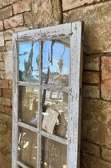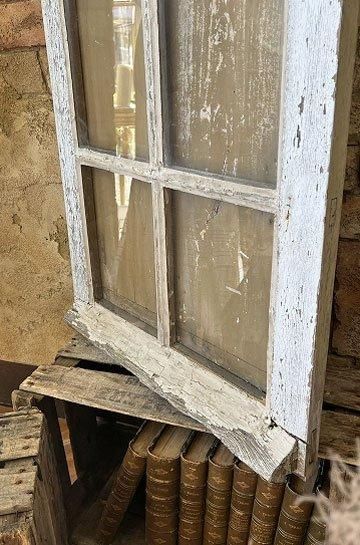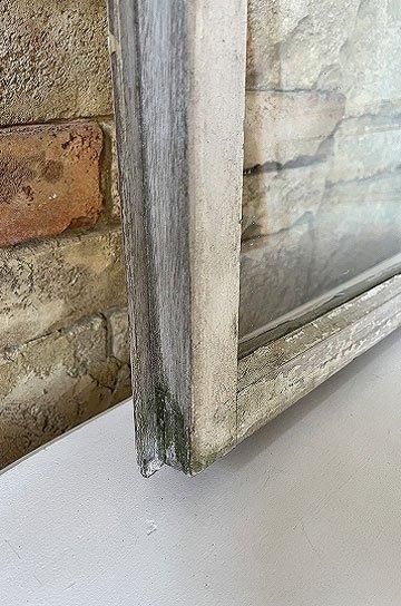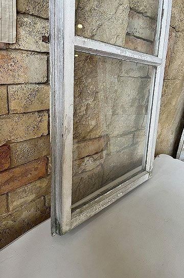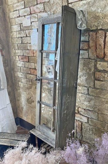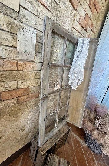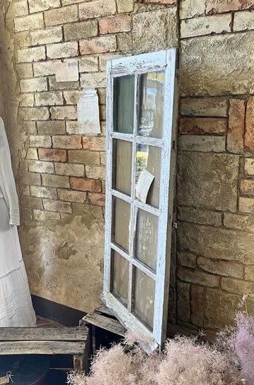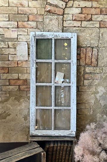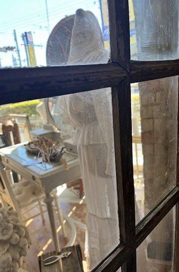 | フレンチアンティークの格子ガラスウィンドウ。8枚のガラスに分かれたクロス格子窓。その窓の上には室内側から陽射しを遮る南向きの2枚折れ戸が付いた嬉しい形のアンティークウインドウ。格子ガラスの木枠はモスグレーのペイントが剥げかけて、オークの木目が見え隠れするシャビーなアンティーク窓です。温もりのある木製の木枠は格子にエッジがそれぞれについて立体的な美しい木製窓。フランスシャトーの邸宅の窓として、外の風景を美しく切り取ってインテリアの一部として魅せてくれます。窓越しに腰掛けて木製のシルエットが花やアンティークレースとの相性抜群にニュアンスを作ってくれます。年月を経過したペイントがアンティークならではの風合いで、錆びかけのオリジナルの金具と共に温かみのある窓辺が広がります。薄っすらとブルー掛かったハンドメイドガラスが残されて、ウルウルガラスが艶やかに反射する懐かしいガラス窓です。勿論、このまま立てかけて、撮影シーンに効果的な窓としても人気。窓辺が素敵に映えるフレンチアンティークのガラス格子窓です。 | ![]() | ||||||||||||||