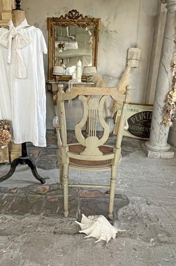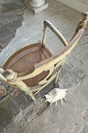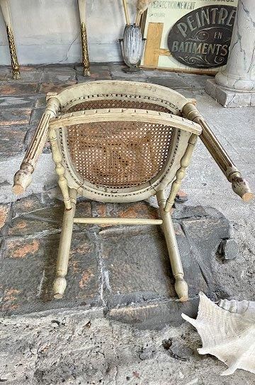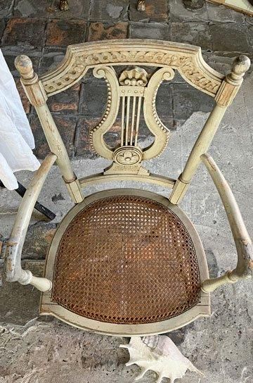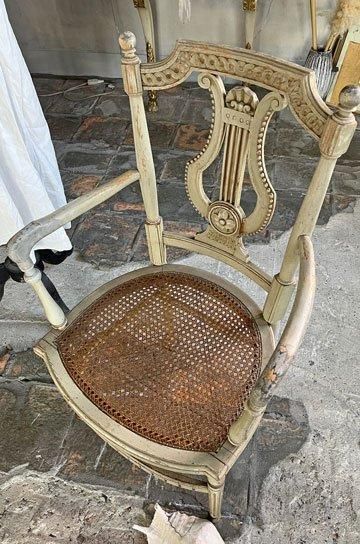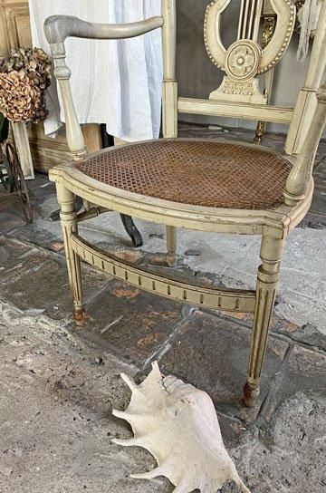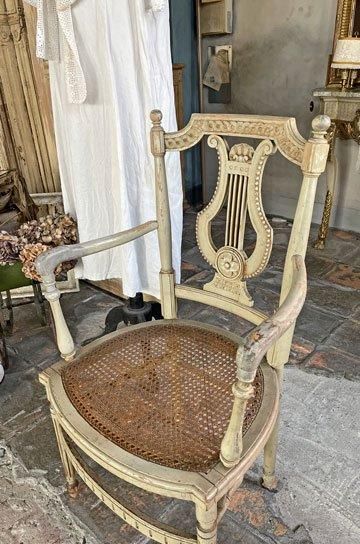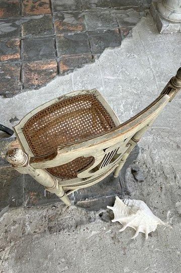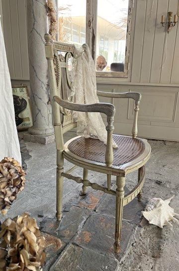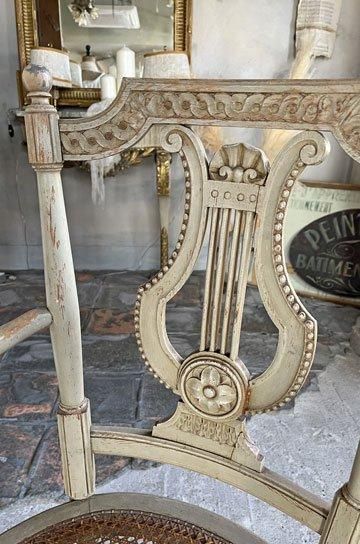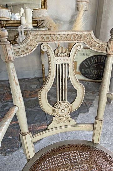 フレンチアンティークのルイ16世アームチェア。家具職人と彫刻職人によって丁寧に作られたハープモチーフの背のデザインが美しい。コーナーにはハスク彫刻が施された凹凸の深い職人気質を感じる調和のとれた美しいデザインです。背もたれトップにはガドルーニングの繰り返す模様は永遠の願が込められています。脚は花の彫刻とストレートのフルーディングのアダム・フルーテッドで、伝統的なルイ16世様式。座面は蒲鉾型でケイン編みが施された持ち運びも楽なオリジナルコンディションデ、透け感が、現代のシャビーシックなインテリアにもよくマッチします。シャトの客間の装飾家具等として使われていたルイ16世チェア。繊細な彫刻とアンティークならではの存在感のある、フレンチアンティークのルイ16世アンティークアームチェアです。
