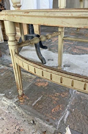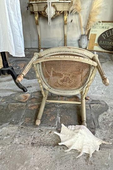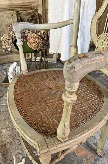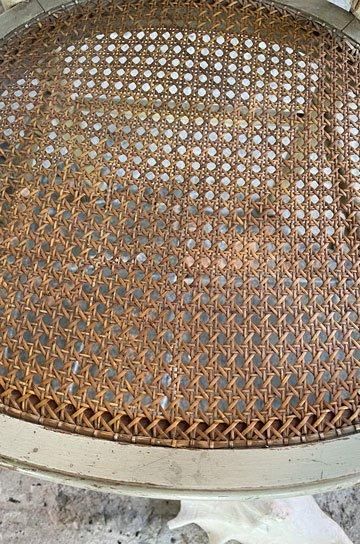 座面は蒲鉾型でケイン編みが施された持ち運びも楽なオリジナルコンディションデ、透け感が、現代のシャビーシックなインテリアにもよくマッチします。