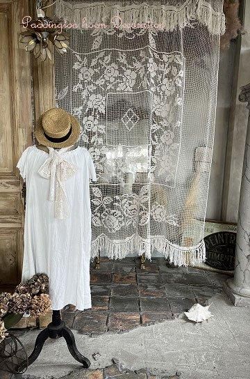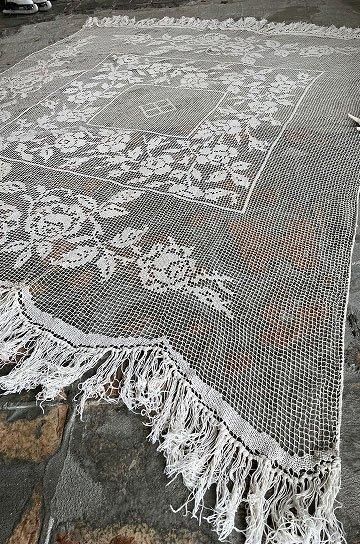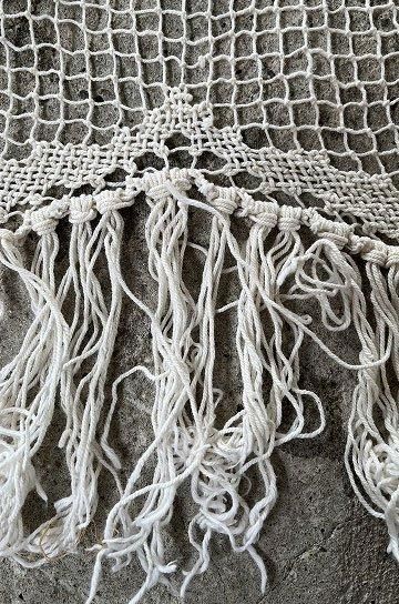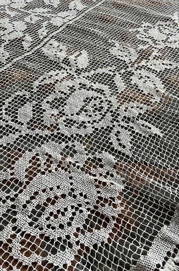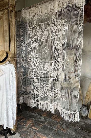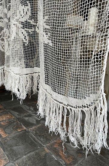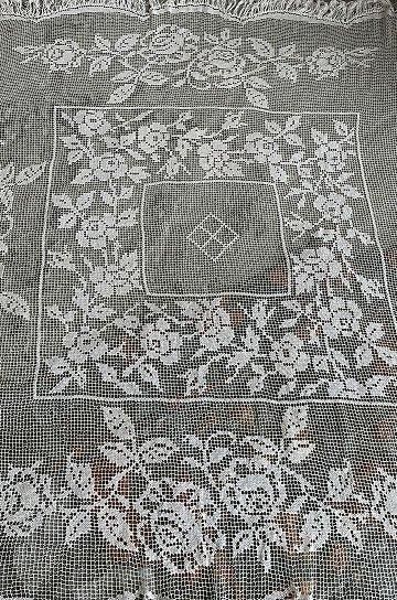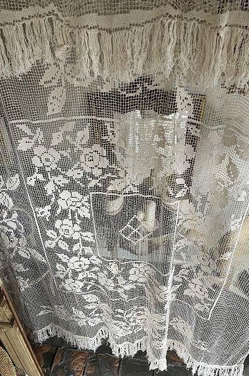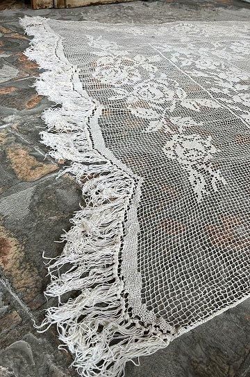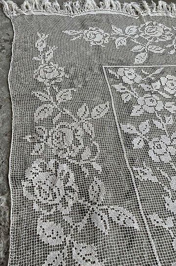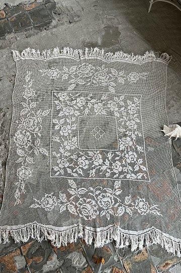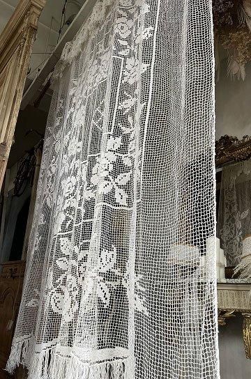フレンチアンティークのローズ柄大きなフィレレース。透け感のある大きな網地模様に、大ぶりな図案が美しく映えるフィレレースです。糸の密度で表現された美しい図案はデザインのセンスが求められ、表現力の素晴らしいフィレレースは迫力があります。センターにはローズブーケ柄が施され、周囲を額のように形のフレームで飾られて。トップとアンダー両サイドには大きなスイングスカラップリムに太めのフリンジが付いていて、ベッドの両サイドに垂らしていたデュヴェカバーだったようです。しなやかさと大胆な重量感でたっぷりとローズの模様が散りばめられたハンドメイドの、時間と労力、センスが伝わってくるアンティークならではの大作です。アイデア次第で、部屋や空間を間仕切るパーテーションとして天井から吊るしたり、窓辺や空間に吊るして光を通すと柄が一層浮き上がって美しい模様がより楽しめます。とても貴重なアンティークならではの年月を経過した風合いが雰囲気のある、フレンチアンティークフィレレースです。 | ![]() | ||||||||||||||