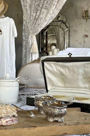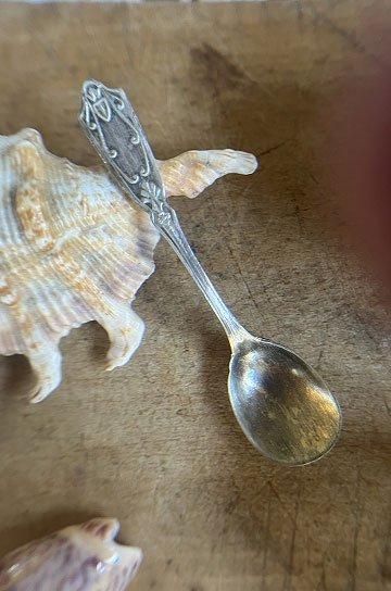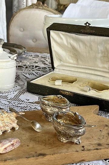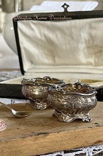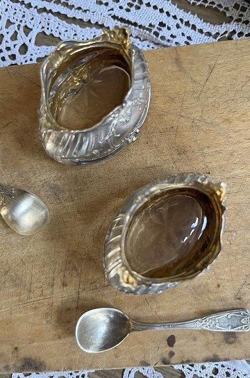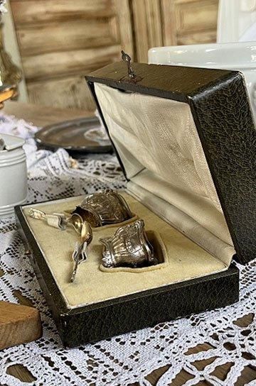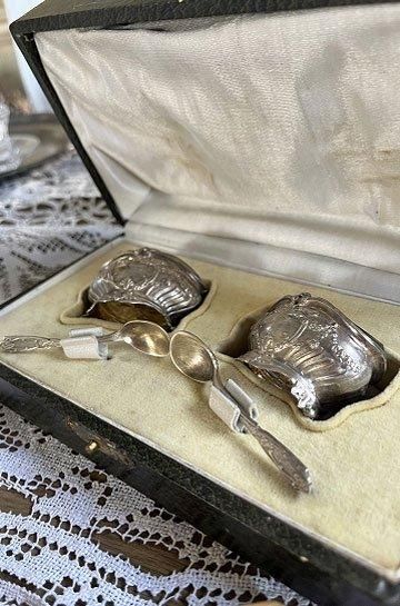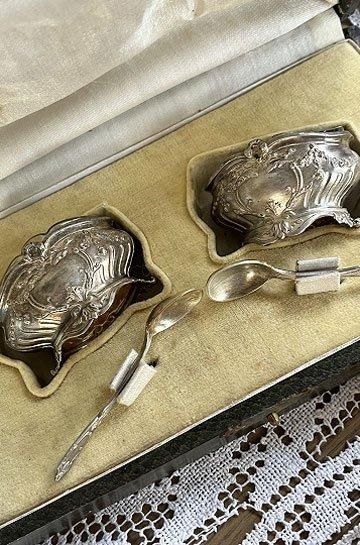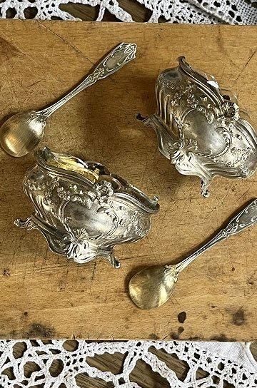 ![]() シルバーとガラスの相性良くテーブルディスプレイになるフレンチアンティークスプーン付きマスタードポット2点セットです |