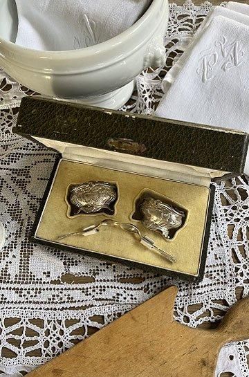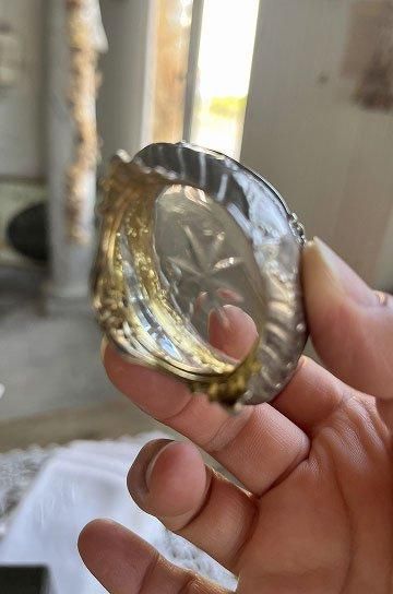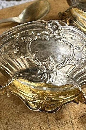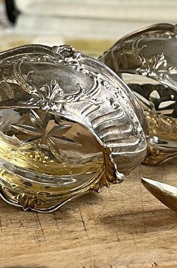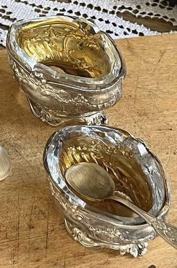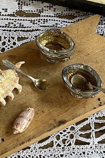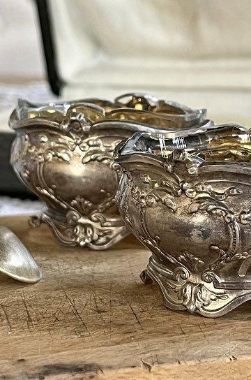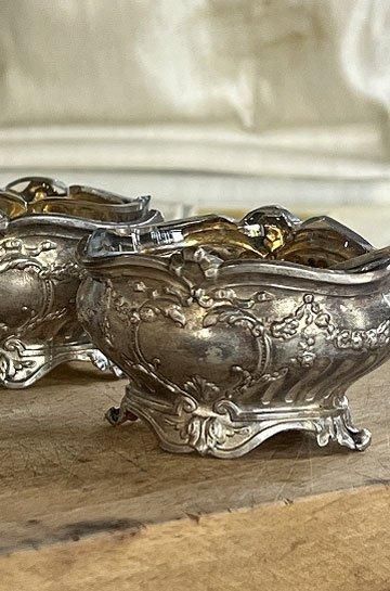 フレンチアンティークシルバーのスプーン付きマスタードセット。ロカイユ模様のロココ調シルバー製マスタードポット2ケスプーン付き。星形カットワーク入りガラスとシルバー製マスタードポットがセット。クリアガラスでハンドカッテイングされたシャープな星形が透かした模様がキラリと美しいシルバー製のマスタードポット。昔ながらの手作りガラスで、気泡やゆらぎがあって、キラキラと輝いています。ソルトとマスタードポットとシルバーポットとクリアガラス2点セット。手のひらサイズのミニチュア的なデザインの少し小さめが奥ゆかしく煌びやかに存在感があります。シルバーとガラスの相性良くテーブルディスプレイになるフレンチアンティークスプーン付きマスタードポット2点セットです。 | ![]() | ||||||||||||||