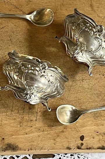 ![]() ロカイユ模様のロココ調シルバー製マスタードポット2ケスプーン付き。 | ![]() 星形カットワーク入りのー純銀製のスパイスセット。 | ||||||||||||||