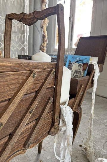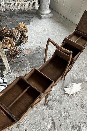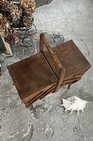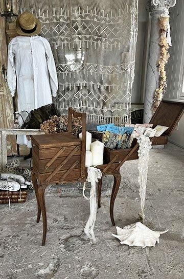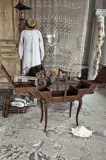 年月を経過した風合いが美しいアンティークレースやアンティークボタンと共にコレクションしたいソーイングボックス。明るい窓辺でお気に入りの椅子に腰掛け、手仕事の時間になると、椅子の隣にこのソーイングテーブルを置いて刺繍や編み物を楽しんでいた風景が広がって。