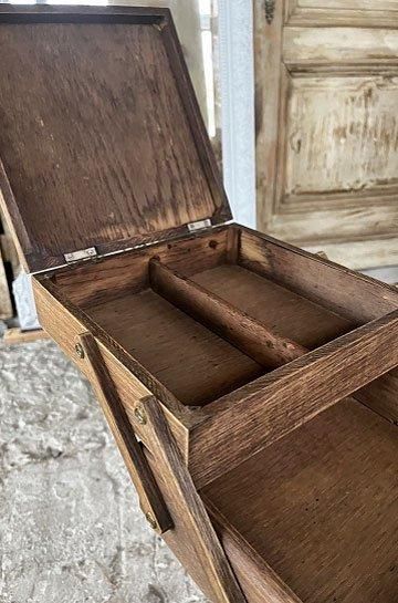 フレンチアンティークのソーインテーブル。優しい色合いがグラデーションに並ぶ刺繍糸コレクションや、コツコツ貯めたアンティークレース、ボタンや編み棒、針、ハサミ等々…お裁縫道具が詰め込まれて、代々受け継がれて大切にされていたソーイングボックスです。木目が味わい深いオークの木肌とナチュラルなブラウン色がシックにインテリアに溶け込んで。三段の宝石箱のように蓋を開けて広がり沢山の小物が仕分けして収納できるソーイングボックスです。曲線的なバルスターハンドルは手に馴染み持ち運びし易い。開閉する為の斜めアームも装飾的なポイントになっています。優雅な曲線が美しいシンプルなカブリオールレッグの脚は、脚先に向かって細くなってゆく華奢で繊細なデザイン。年月を経過した風合いが美しいアンティークレースやアンティークボタンと共にコレクションしたいソーイングボックス。明るい窓辺でお気に入りの椅子に腰掛け、手仕事の時間になると、椅子の隣にこのソーイングテーブルを置いて刺繍や編み物を楽しんでいた風景が広がって。糸や材料等をさっと手に取りやすい位置に置けるので便利です。もちろん普段は素材や道具達をコンパクトにしまっておける、見せる収納として。実用性と、装飾家具としての存在感で、インテリアに気軽に取り入れたい、フレンチアンティークのソーイングテーブルです。