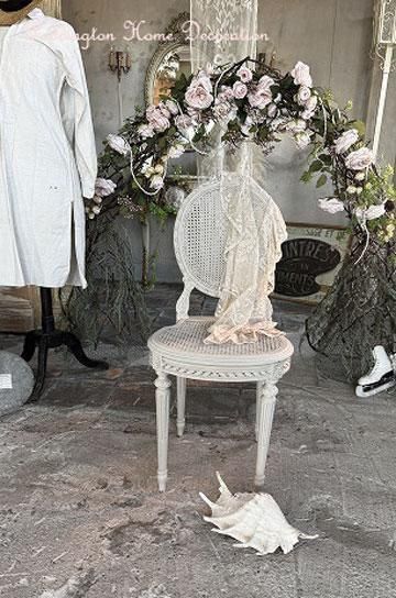 フランスアンティークのローズバルーンバックチェアb。リビングや客間などの装飾家具として使われていたフレンチアンティークチェアです。リビングや客間などの装飾家具として使われていたフレンチアンティークチェアです。オーバル形フレームの背もたれは家具職人が無垢の木から削り出したカーブが美しい。背もたれのリボンとローズのカーヴィングはルイ16世スタイルの美しく絵になるアンティークチェアです。透け感のあるケイン編みが軽やかな雰囲気で、テーブルにセットした時も圧迫感無く、美しい佇まいです。ケイン編みで軽く、細身のバールーンの形は、貴婦人型を小さくこじんまりと美しく映るようにデザインされたシャトーの椅子。お城で使われていたシャビーホワイト塗装のアンティークチェア。シックな佇まいと美しいデザインが何処に置いても絵になる、フレンチアンティークチェアです。