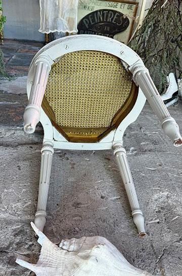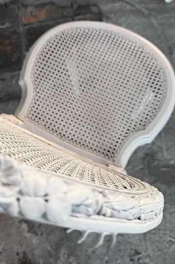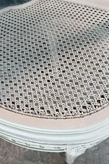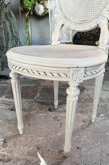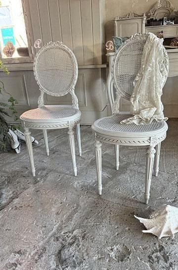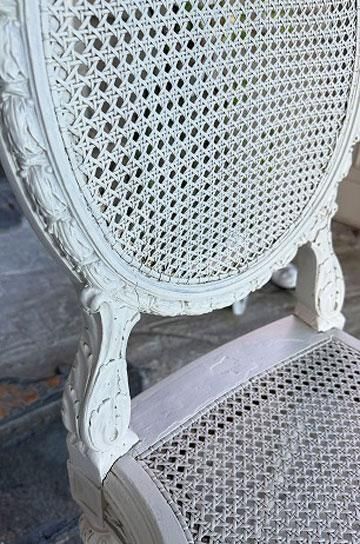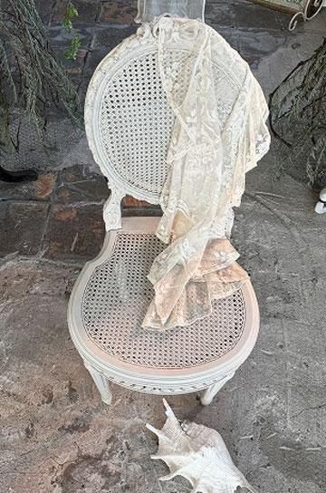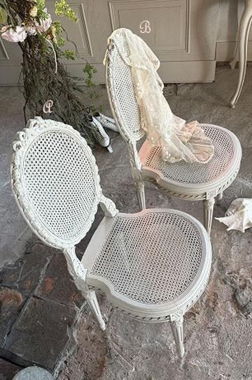 。ケイン編みで軽く、細身のバールーンの形は、貴婦人型を小さくこじんまりと美しく映るようにデザインされたシャトーの椅子。