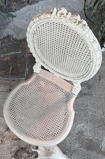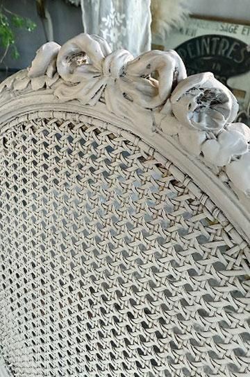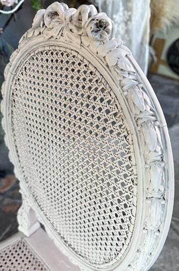 備考木製にシャビーホワイト塗装、リボンとローズのカーヴィンぐの背もたれ。ケイン編みのバルーンバックチェア。