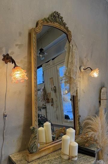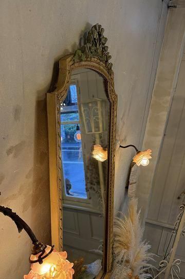 ![]() ミラーの周囲を囲むリボンの彫刻とネックレースのようにビーディングされて立体感を増して。 | ![]() 年月を経過した鏡の、所々渋みのある風合いがアンティークミラーならではの味わい深さを醸し出しています。 | ||||||||||||||