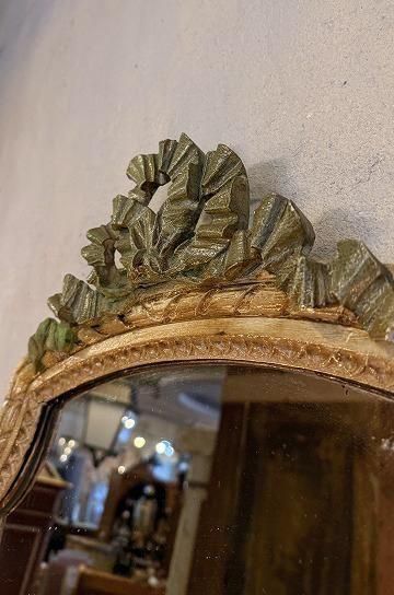 フレンチアンティークのリボンのアンティークミラー。お屋敷の壁面を飾っていたマントルピース上やコモード上、サロンルームや客間の装飾等として使われていた、大きめな壁掛けモールディングミラーです。立体感があって迫力のある豪華なモールディングは、ルイ16世スタイルの人気のリボンとアカンサスリーフ彫刻がシンボリックなアンティークミラーです。立体的にフレームから飛び出した形のリボン装飾は山形のアーチのトップに装飾されています。フレームの付けにアカンサスリーフが両サイドに彫刻されてい織ます。ミラーの周囲を囲むリボンの彫刻とネックレースのようにビーディングされて立体感を増して。年月を経過した鏡の、所々渋みのある風合いがアンティークミラーならではの味わい深さを醸し出しています。立体感が生み出す陰影で、パウダー色に表情豊かで、ぐっと存在感を発揮してくれます。室内に明るさと奥行き感を出してくれる、大きなミラー。飾るだけで部屋の雰囲気をクラシカルにランクアップしてくれる、フレンチアンティークのモールディングミラーです。 | ![]() | ||||||||||||||