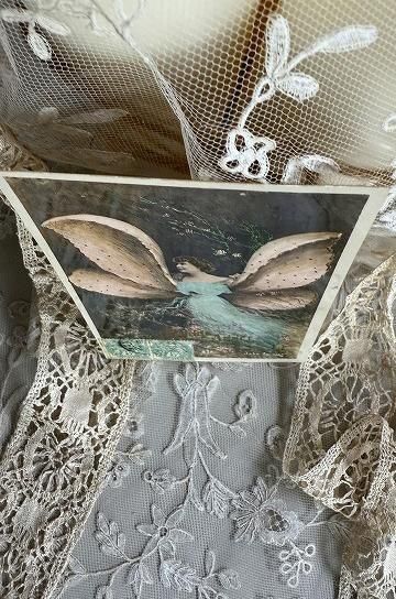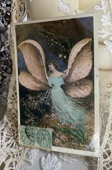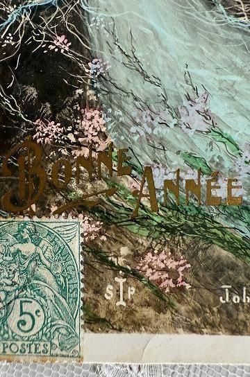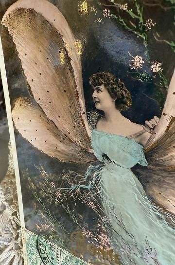 フレンチアンティークのポストカード。フェアリーの羽をもつ女性のポストカード。アーティストのジョン・ローランの作品のポストカードです。新年のお祝いのメッセージが箔付き文字で描かれています。躍動感のある女性が飛び立つ瞬間を表現した一枚です。切手は1900年〜1929年に発行されていた「自由、平等、平和」が描かれたデザインで、その上にはオリジナルのスタンプが残っています。フランス生まれの最も古い写真印刷技術コロタイプ印刷は、手間と時間がかかり、2〜3千枚しか印刷出来ない上に複版出来ない、高級写真印刷技法で、現在ではほとんど使われていません。現代の印刷の様なドットが無いので、写真を美しく忠実に再現し、なめらかな表現力が魅力で、絵葉書やアルバム、絵画の複製等に使われていました。多色刷りが難しいので、ポイントをハンドペイントで色付けされています。こちらはドレスのブルーと、羽のピンク、花のパープルや葉のグリーン色が入れられています。年月を経てエクリュ色になった古いカードの風合いが儚げ。裏面の手描き文字も美しく繊細です。ディスプレーに加えるだけでぐっとアンティークな雰囲気が作り上げられる、フランスアンティークのポストカードです。 | ![]() | ||||||||||||||