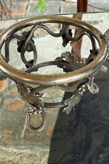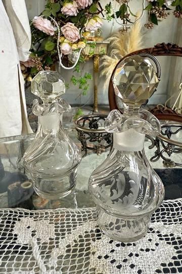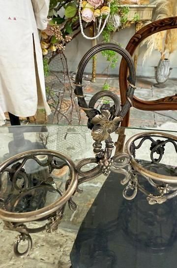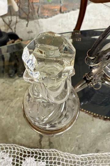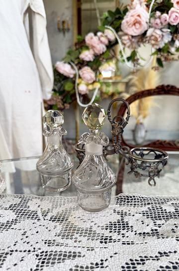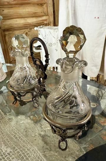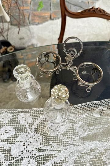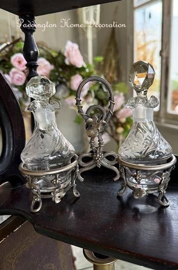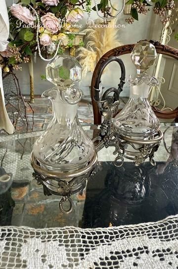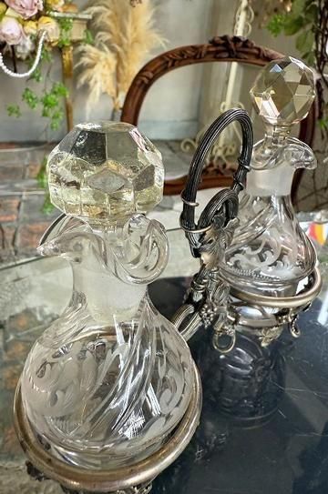 フレンチアンティークのシルバー製クリスタルガラスサーヴィスセット。ヴィネグリエ(ビネガー差し)、ウイル(オイル入れ等として使える調味料入れサーヴィス3点セットです。ハンドル付きの煌びやかな重厚なシルバー製の台座。丸いシルバーのハンドルに葡萄のモチーフがついて。厚みのあるクリスタルガラスのシャープなダイヤモンドカッティングが美しい蓋付きの美しいシルエットのヴィネグリエ2個。流線形のボトルに花模様がエッチングされています。キラキラと透明感のあるボトルにエッチング模様が品よく見せてくれます。美しいガラス製は透明感があって、テーブルが華やかに。アンティークのあるテーブルコーディネートに、普段使いやお客様を招いてのパーティーしたくなるシルバー製クリスタルガラス。フレンチアンティークのシルバークリスタルサーヴィス3点セットです。 | ![]() | ||||||||||||||