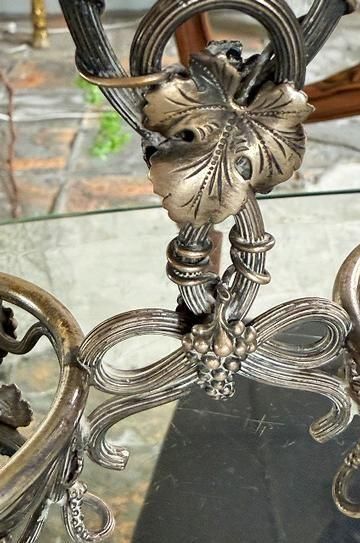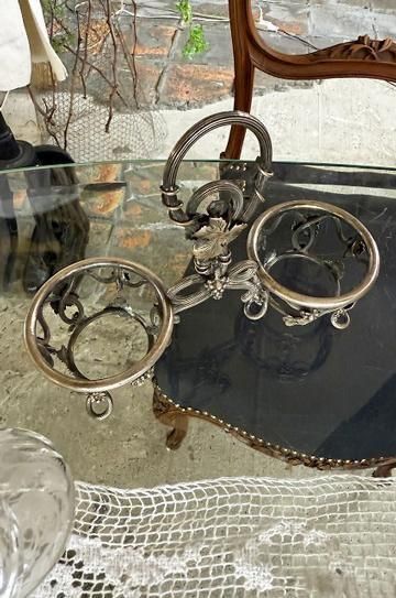 ![]() ヴィネグリエ(ビネガー差し)、ウイル(オイル入れ)、等として使える調味料入れサーヴィス3点セットです。 | ![]() ハンドル付きの煌びやかな重厚なシルバー製の台座。 | ||||||||||||||