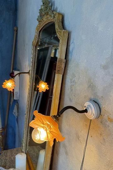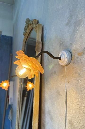 フレンチアンティークのローズピンクガラスシェード壁掛けライト。壁の固定するプレートは、白い陶器製で壁面をクラシカルに飾っていた、シンプルで清潔感のある華やかなウォールライトです。壁から真鍮のアールのブラケットアームが丁度良い角度で支えてくれて。その先には、ローズ花びらが象られた一凛の薔薇の花が灯りを照らしてくれるフリルシェードランプ。ほんのりピンク色の灯りをともしてくれます。フリルシェードのガラスはマットなピンクのフロスト加工されてクラシックな灯りの趣。玄関や廊下等、フレンチシックなインテリアに良く似合います。魅力的なピンクのイメージが膨らむフレンチアンティークのローズの壁掛け古いるシェードランプ。 | ![]() | ||||||||||||||