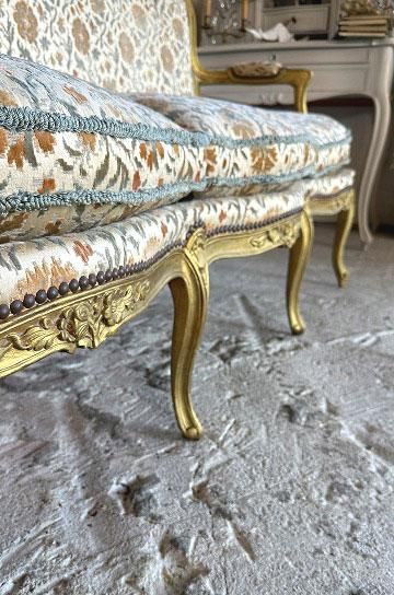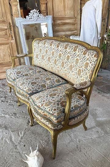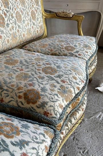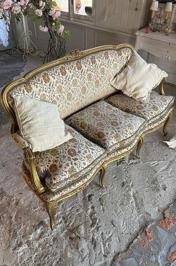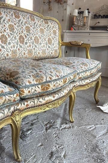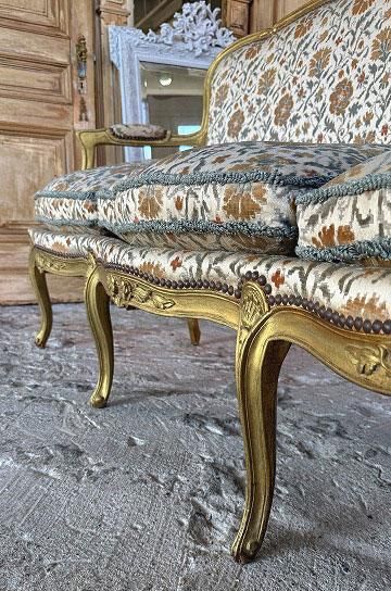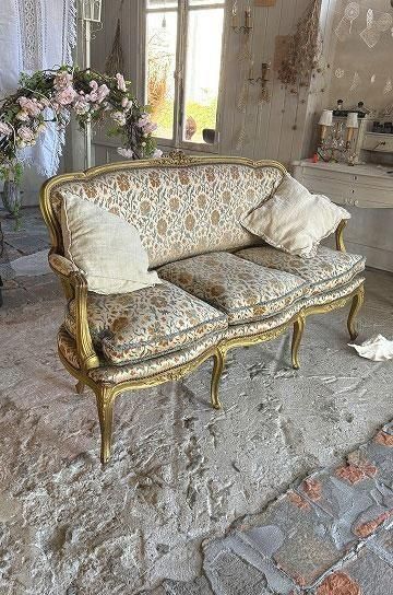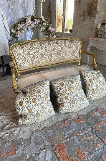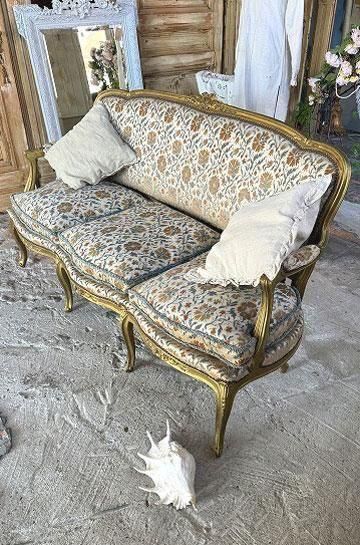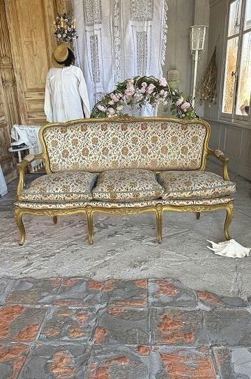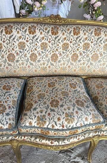 ![]() 豪華なブルージャガード生地張りとゴールドフレームのルイ15世アンティークソファです。 | ![]() センターにシンメトリーのローズが彫刻されて優雅な美しさを放つ3シーターソファー。 | ||||||||||||||