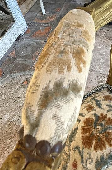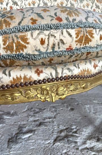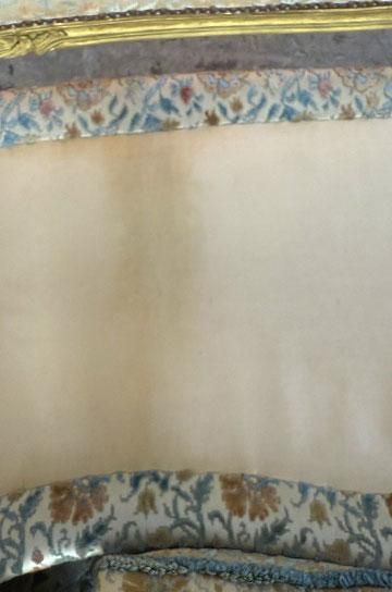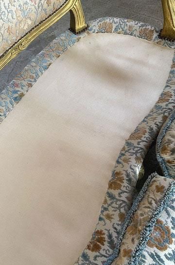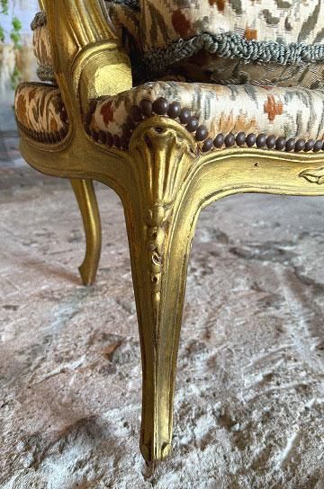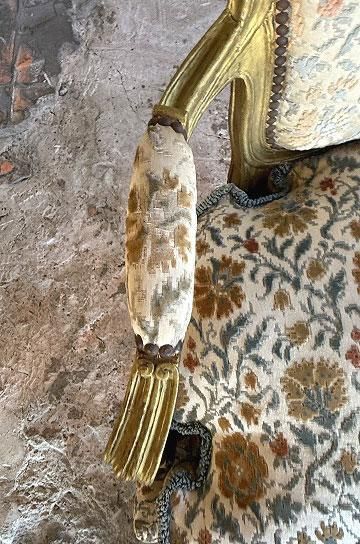 ![]() 座面はリバーシブルの共布で弾力性のある新品フェザークッションが入ってふっくらして華やか。 | ![]() ブ座面の下のチェアレールもアカンサスと花の透かし模様で飾られて。 | ||||||||||||||