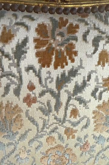 ![]() ブルーグレートリムは起毛したベルベット素材で、植物模様部分と高低差がある、美しいジャガード織りの生地は年月の経過で色褪せて、アンティークらしい色合いになっています。 |