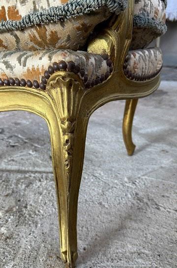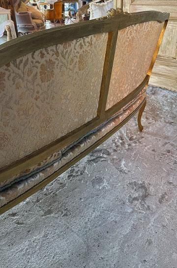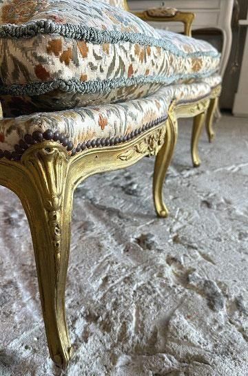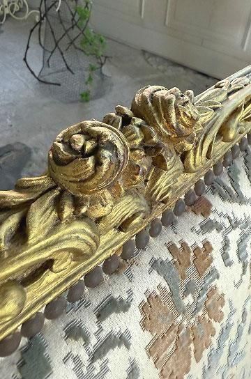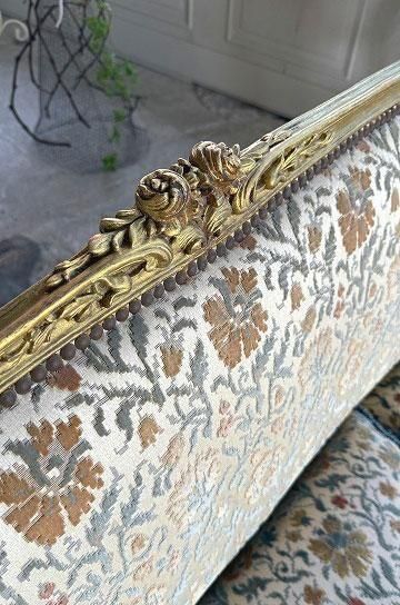 フレンチアンティークのローズ彫刻の3シーターバンケット。豪華なブルージャガード生地張りとゴールドフレームのルイ15世アンティークソファです。ロココ調フレームは背もたれからアームの先まで流れる曲線を描いています。ひざ下の座面も曲線を描いて。センターにシンメトリーのローズが彫刻されて優雅な美しさを放つ3シーターソファー。マットなゴールド塗装が落ち着きのある威厳を感じさせます。背もたれは光沢のあるジャガードが薄っすらとブルーとアンバーが交互に光ります。座面はリバーシブルの共布で弾力性のある新品フェザークッションが入ってふっくらして華やか。美しい曲線のアームもファブリック張りで快適。フロントから見ると脚へとつながる美しいシルエットを描いています。座面の下のチェアレールもアカンサスと花の透かし模様で飾られて。脚はカブリオールレッグで、ちょこんと立つ姿が華奢で優雅な印象です。ブルーグレートリムは起毛したベルベット素材で、植物模様部分と高低差がある、美しいジャガード織りの生地は年月の経過で色褪せて、アンティークらしい色合いになっています。自慢の装飾家具として、客間やリビングを飾って豪華なカフェの時間を楽しんだり、ショップのディスプレーやスタジオの撮影にも存在感を発揮してくれます。重厚で煌びやかな雰囲気が絵になる佇まいのフレンチアンティークのローズ彫刻の3シーターバンケットです。 | ![]() | ||||||||||||||